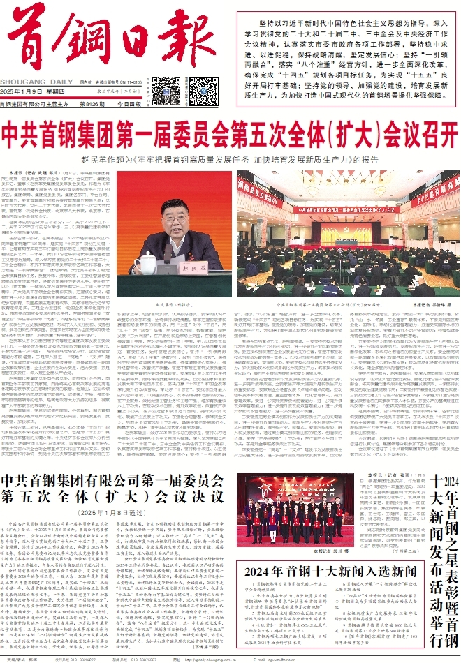 1月8日,中共首钢集团有限公司第一届委员会第五次全体(扩大)会议召开。集团党委书记、董事长赵民革受集团党委常委会委托,作题为《牢牢把握首钢高质量发展任务 加快培育发展新质生产力》的报告。集团领导、集团党委委员;集团各部门、平台公司、直管单位、要素管理单位和部分授权管理单位领导人员;党的十九大代表、党的二十大代表、北京市第十三次党代会代表、首钢第一次党代会代表,北京市人大代表,北京市、石景山区政协委员参加会议。