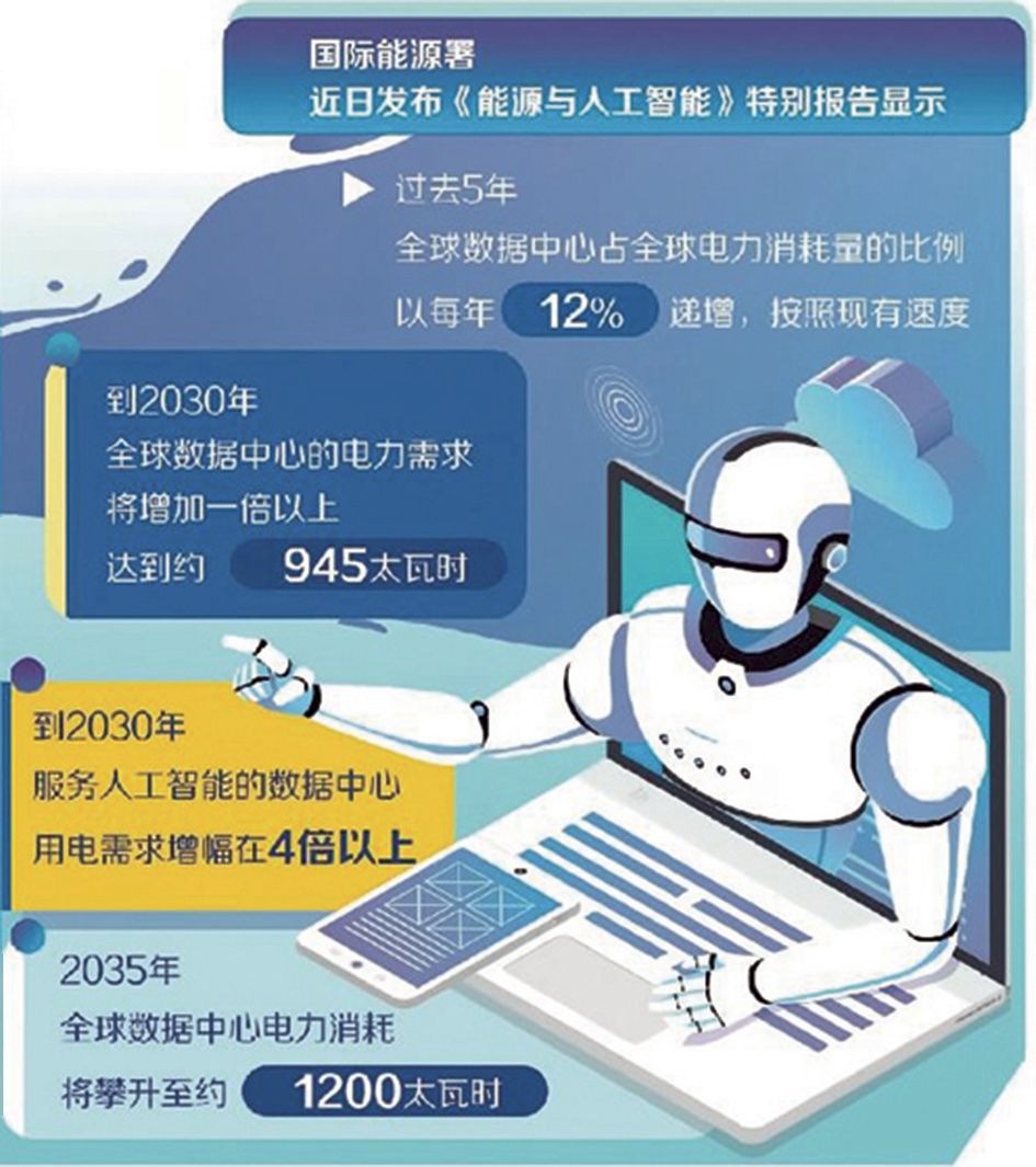 人工智能的研发应用需要大量高耗能的数据中心支撑。2022年以来,各个国家和地区对数据中心的投资几乎翻了一番,2024年投资总额已达5000亿美元。国际能源署近日发布《能源与人工智能》特别报告显示,大规模数据中心建设推动全球电力需求大增。2024年,数据中心约占全球电力消耗的1.5%,达到约415太瓦时。其中,美国在全球数据中心电力消耗中占比最大,达到45%,欧洲约占15%。报告显示,在过去5年,全球数据中心占全球电力消耗量的比例以每年12%递增,按照现有速度,到2030年,全球数据中心的电力需求将增加一倍以上,达到约945太瓦时。到2030年,服务人工智能的数据中心用电需求增幅在4倍以上。2035年,全球数据中心电力消耗将攀升至约1200太瓦时。