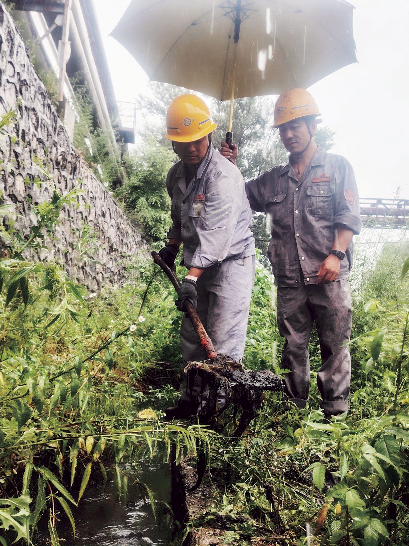 通钢公司轧钢事业部职工清理排水沟杂物。 |