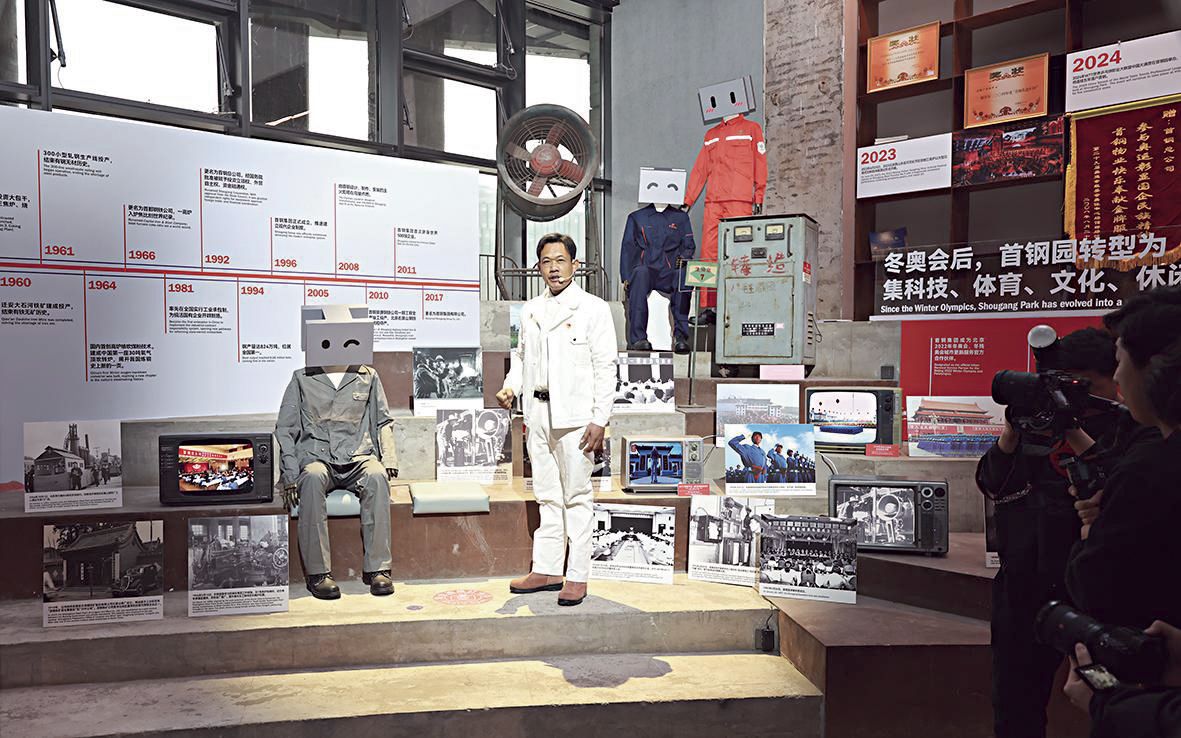 传统钢铁生产现场布景前,原来的炼铁工人,现在的“金牌”讲解员——首钢先进工作者、首钢转型职工代表李红继讲述着自己小时候梦想成为一名首钢炼铁工人,当愿望得以实现还没多久,就面临着因城市需要,首钢选择熄炉的重大抉择,一部分工友背起行囊,远赴300公里之外的渤海湾,从头开始建设一座海上钢铁梦工厂,而自己也走上新的岗位,以亲身经历为大家讲述当初的那段辉煌。“钢三代”桑尔豪从家中长辈在首钢工作的激情岁月,感受到作为一名首钢人的骄傲,如今,自己也成为三高炉转型升级的一名设计师,让“薪火相传”有了最鲜活的注脚。